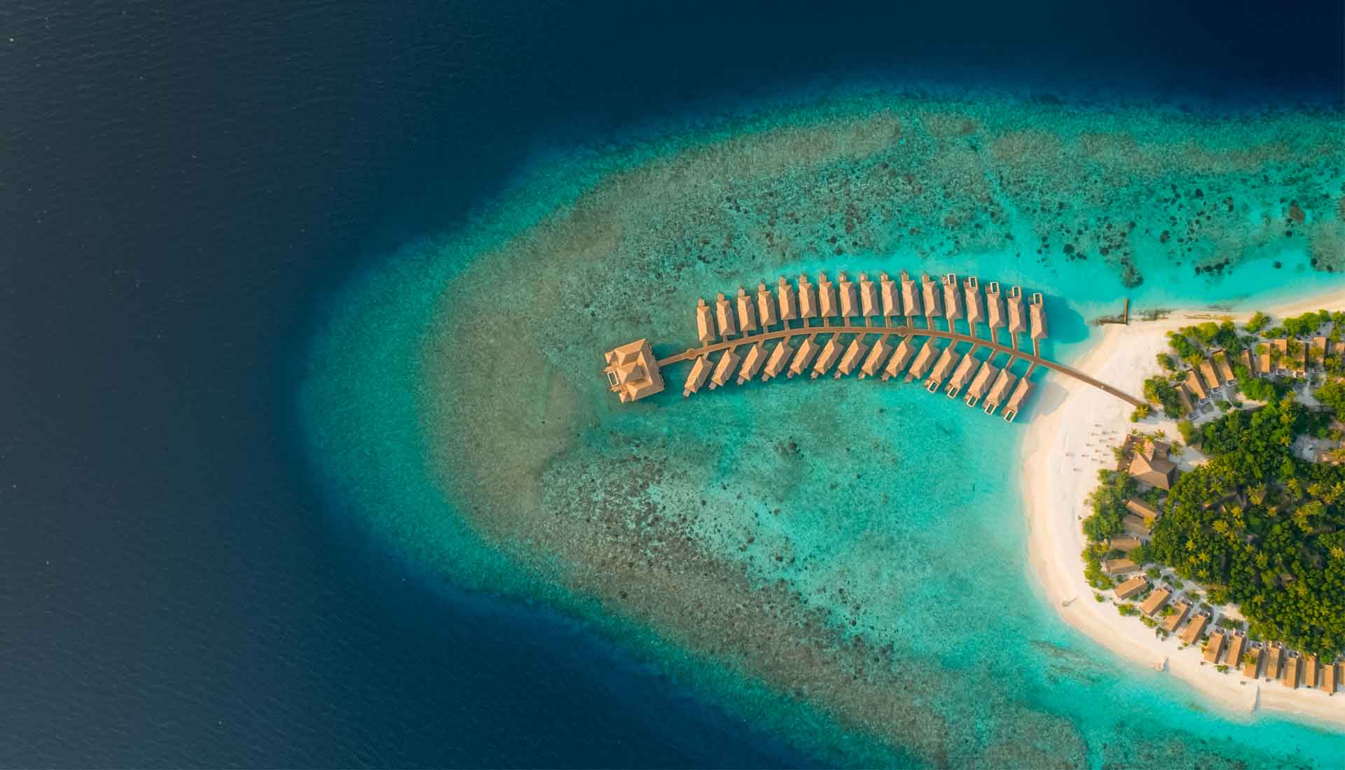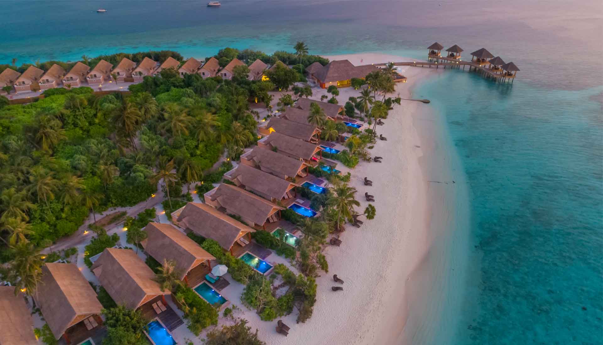 Das Resort bietet moderne Strand‑ und Wasser‑Villen, darunter Optionen mit privatem Pool und eine Präsidentensuite, die alle komfortabel und elegant gestaltet sind – mit direktem Zugang zur Lagune oder zum Strand.
