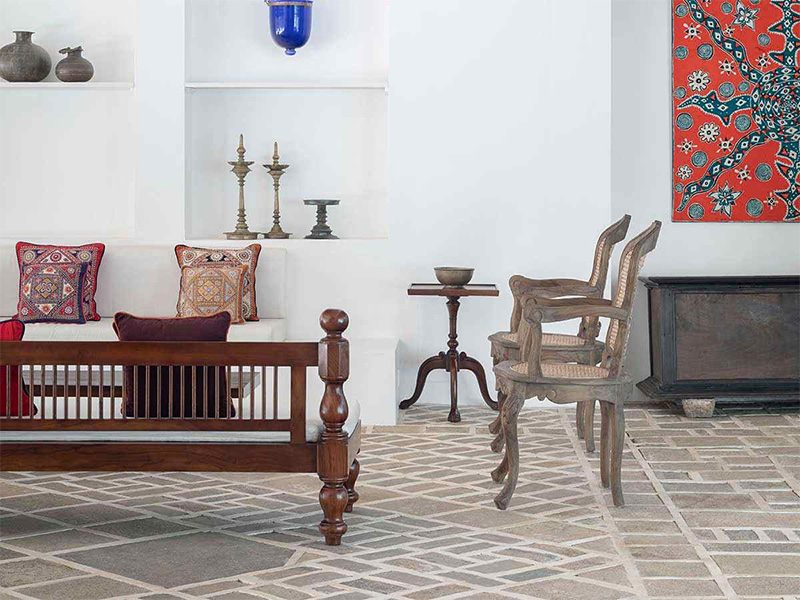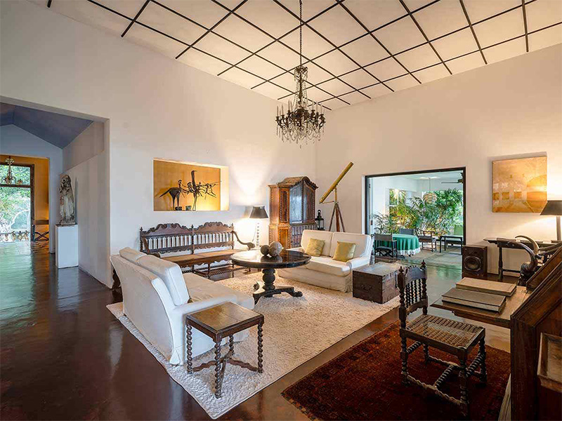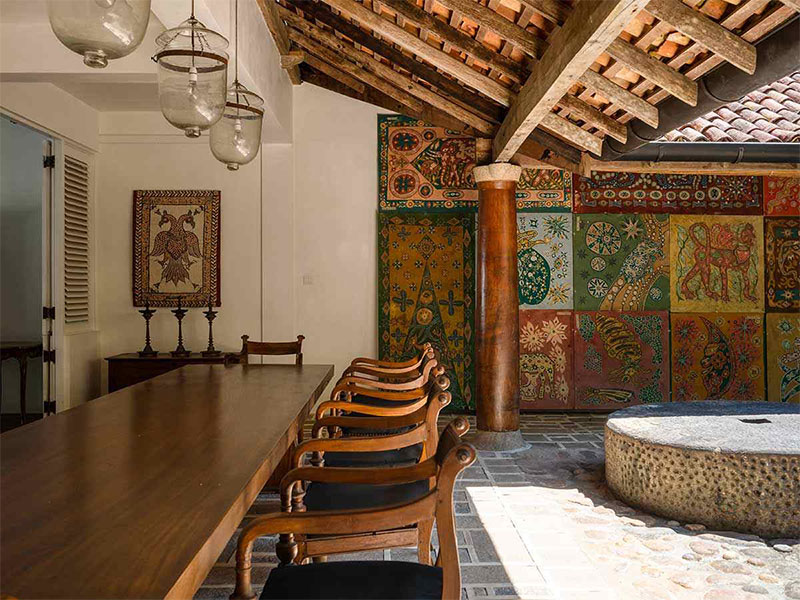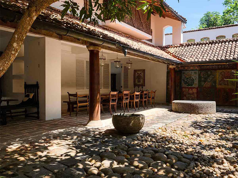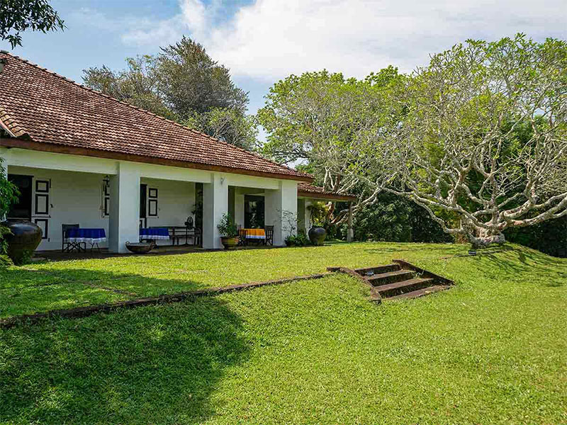 Die Unterkünfte bestehen aus dem historischen Country House und verstreuten Bungalows, die individuell gestaltet und liebevoll eingerichtet sind. Alle Suiten bieten Blick auf die Gärten, den See, Baumkronen oder entfernte buddhistische Stupas und verbinden Bawas architektonisches Erbe mit modernem Komfort. Einige der freistehenden Gebäude bewahren antike Möbel und Originaldetails, ohne auf zeitgemäße Annehmlichkeiten zu verzichten.