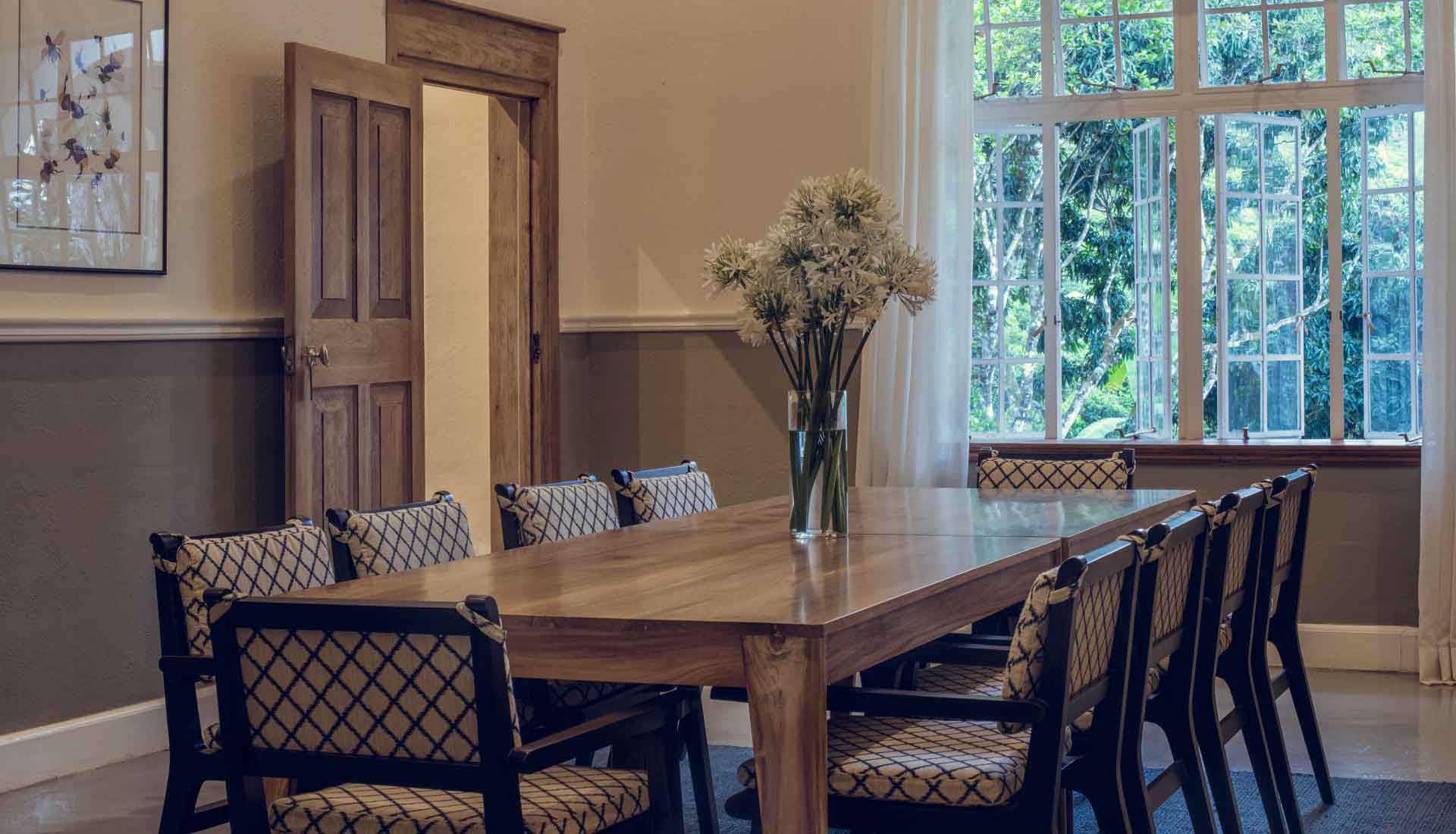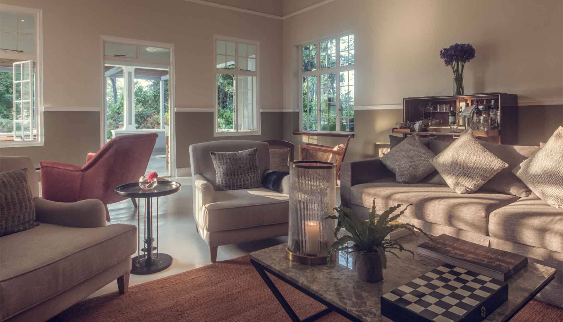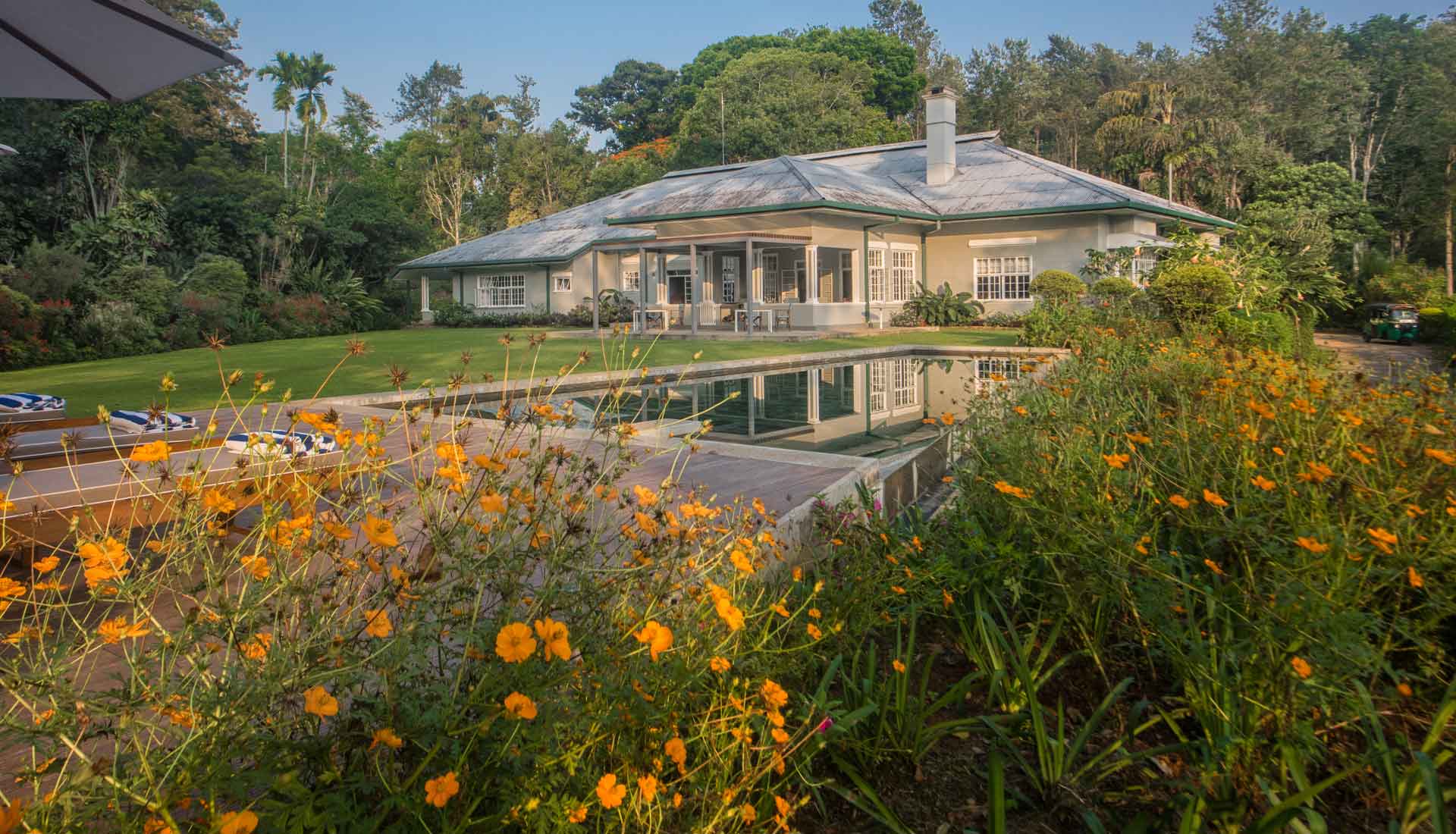 Das Hotel befindet sich in einem liebevoll restaurierten kolonialen Teepflanzer-Bungalow, der zu einem luxuriösen Boutique-Hotel mit nur fünf individuell gestalteten Schlafzimmern umgewandelt wurde. Großzügige Glasflächen, warme Materialien und zeitgemäßes Design schaffen fließende Übergänge zwischen Innenräumen und Natur und eröffnen offene Blicke auf Teeplantagen, Täler und die umliegenden Berge. Von der Terrasse und dem Infinity-Pool aus genießen Gäste eindrucksvolle Panoramen über die grünen Hügel des Hochlands.