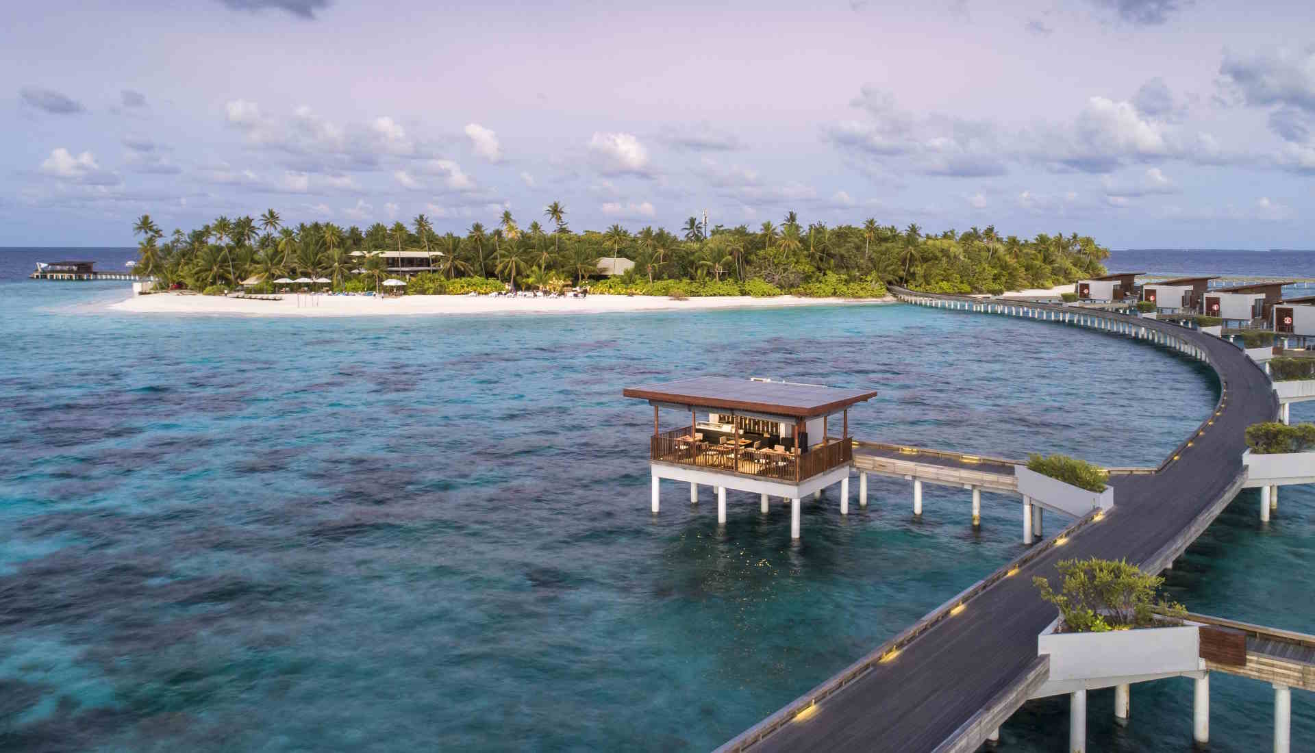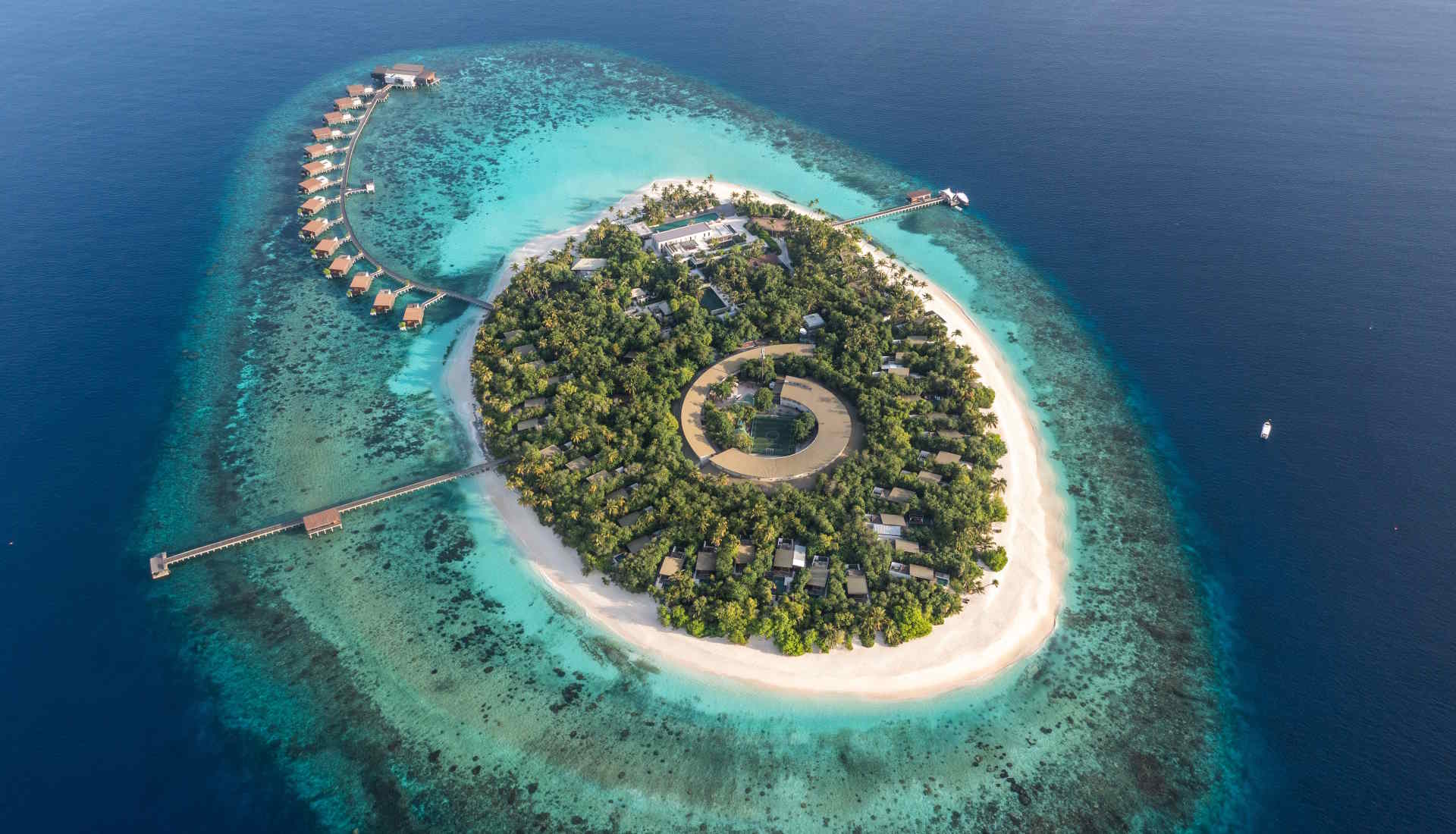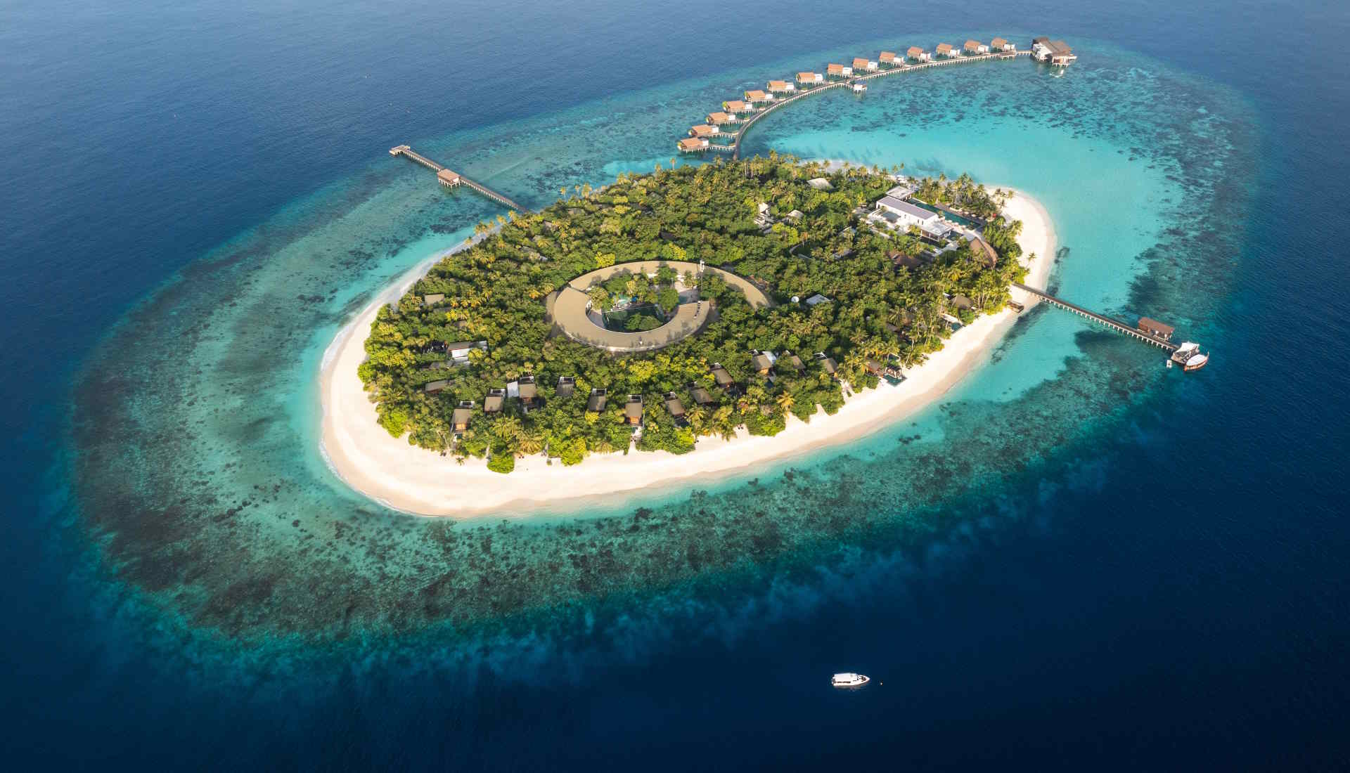 Die Insel selbst hat eine runde Form, und das Hotel fügt sich harmonisch in die natürliche Umgebung ein. Ein besonderes Highlight ist das intakte Korallenriff, das nur etwa 20 Meter von der Insel entfernt liegt. Es bietet ideale Bedingungen für Schnorchler und Tauchbegeisterte, um die atemberaubende Unterwasserwelt zu erkunden. Ein PADI 5‑Sterne Tauchzentrum ermöglicht Tauchprogramme für alle Level, das Hausriff der Insel ist direkt zugänglich.