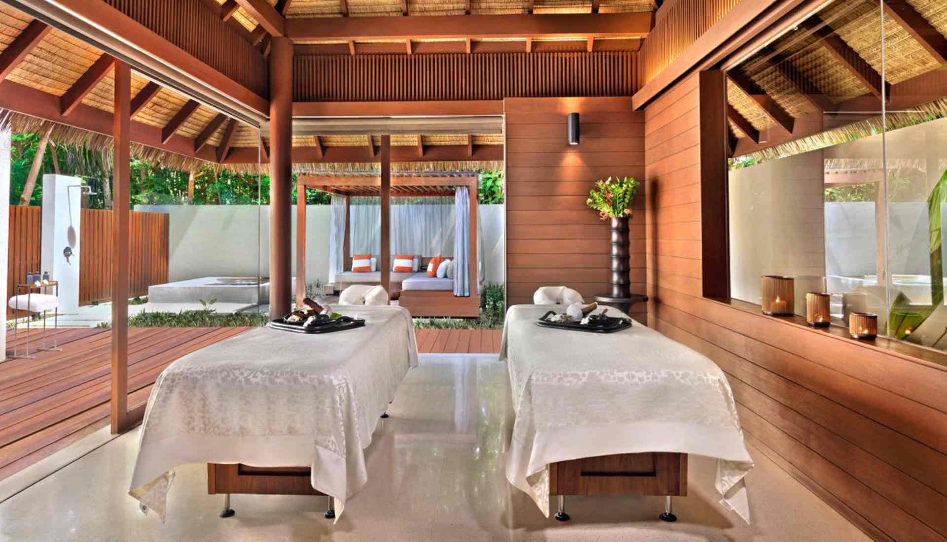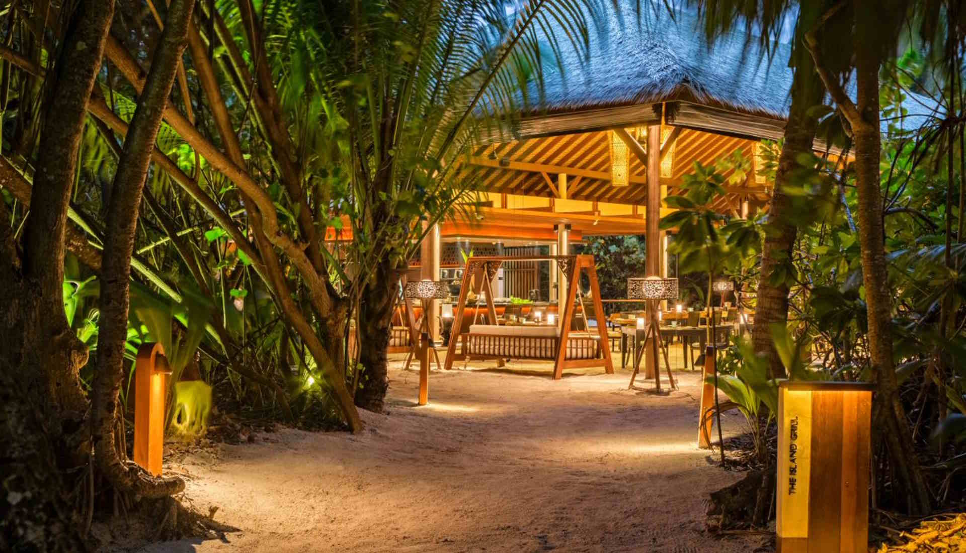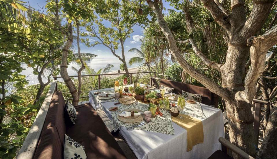 Kulinarisch verwöhnt das Resort mit mehreren hochwertigen Locations: Das „The Dining Room“ (internationale Küche), „The Island Grill“ (regionale Gerichte), das Baumhaus-Restaurant „Chef’s Garden Treehouse“ und private Dinner‑Erlebnisse unter Sternenhimmel oder auf dem Jetty.