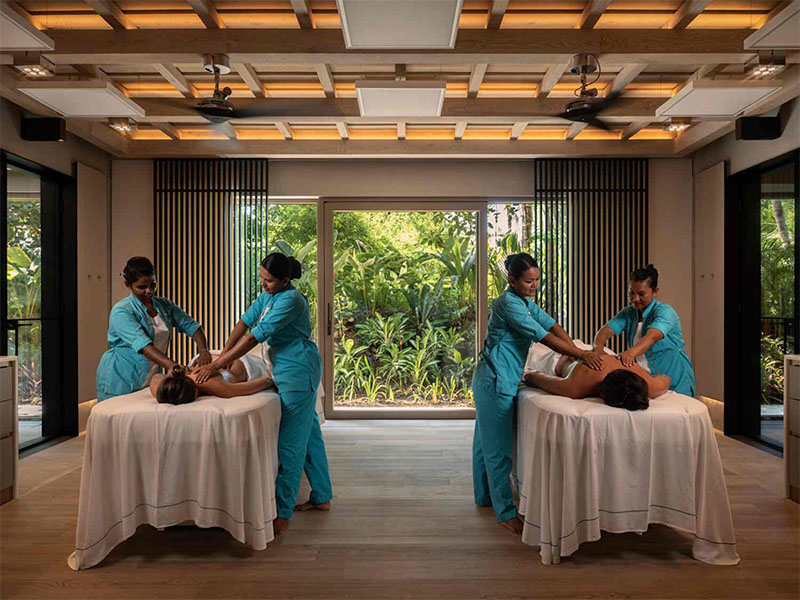 Wellness‑ und Freizeitangebote sind auf höchstem Niveau: Velaa Spa integriert traditionelle asiatische Spa‑Techniken mit moderner europäischer Technologie, und das Resort bietet ein vielseitiges Aktivprogramm mit Wassersport, Schnorcheln, Tauchen, Bootsausflügen, Sunset‑Cruises und Golf‑Academy by Olazábal.